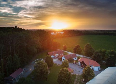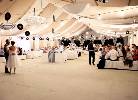 Rendezvénysátrunk 400 m²-en minden igényt kielégít akár 300 fő részére, színpaddal, hang- és fénytechnikával. Alkalmas esküvőkre és nagy létszámú események megtartására. Zöld, ligetes rendezvényterünk szabadtéri terasszal teremt méltó hangulatot a násznép számára.